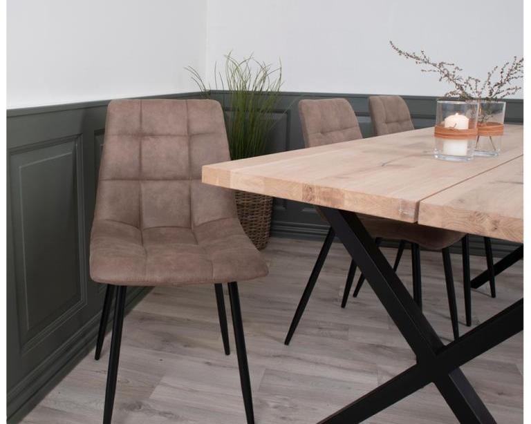 Munkebo spisebordstol med kraftig polstring på sæde og ryg. Stolen er betrukket med slidstærkt lysebrunt micofiber stof, og monteret på et sortlakeret metalstel.