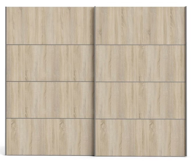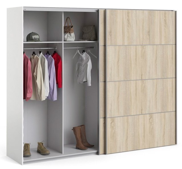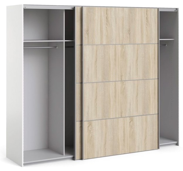 Modena garderobeskab med en brede på 240cm har 4 meget rummelige skabe, som hver er indrettet med 1 hylde og 1 bøjlestang. Dørene er monteret på hjul og skinner, der får dem til at glide let og ubesværet. Et skab der optager et minimum af plads, samtidig med der er fri og nem adgang til indholdet. Dørene er delt i 3 eller 4 felter, det giver et flot udtryk. Korpus og låger er fremstillet i en 15 mm. profil beklædt med folie som gir en flot finish, som er nem at rengøre og ikke kræver nogen former for vedligeholdelse.