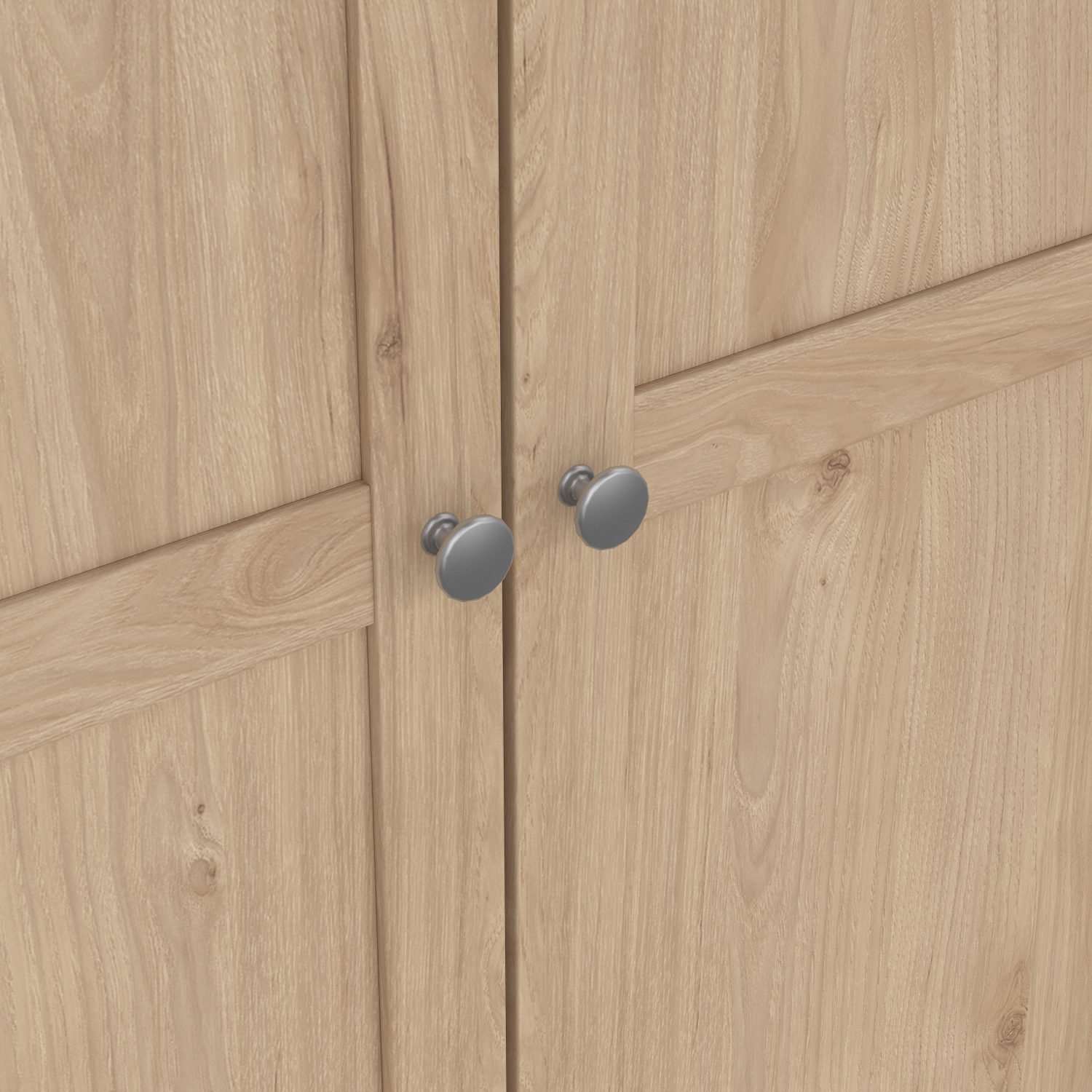 - I venstre side er et bredt skab bag dobbeltdøre monteret med 1 hylde og 1 bøjlestang lige under hylden