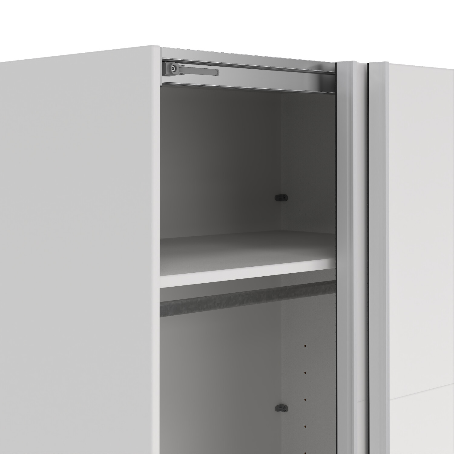 Der medfølger tophylde og bøjlestang til hver sektion. Der kan tilkøbes hyldepakke med 3 ekstra hylder, skuffe modeul med 3 skuffer som fast monteres i skabet og dørdæmper (soft close) til dørene, se tilbehør.