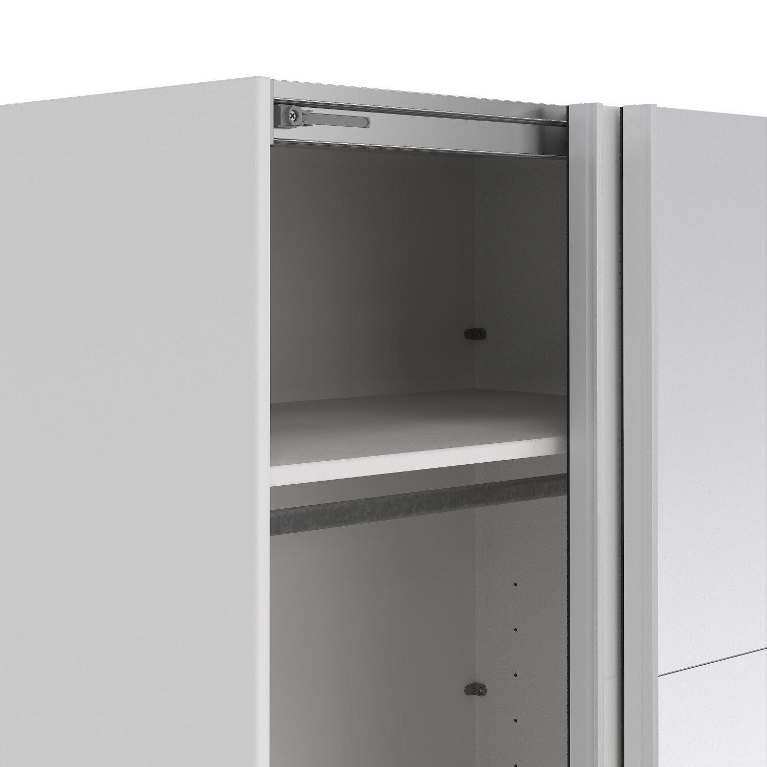 Der medfølger tophylde og bøjlestang til hver sektion. Der kan tilkøbes hyldepakke med 3 ekstra hylder, skuffe modul med 3 skuffer som fast monteres i skabet og dørdæmper (soft close) til dørene, se tilbehør.