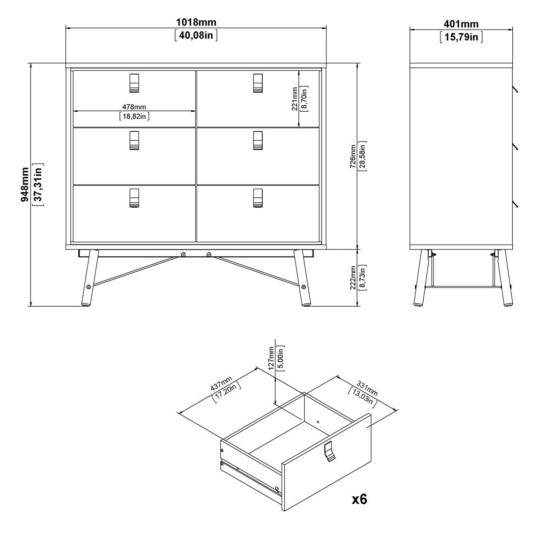 Kommoden måler: H: 94,8 cm, L: 101,8 cm, D: 40,1 cm.