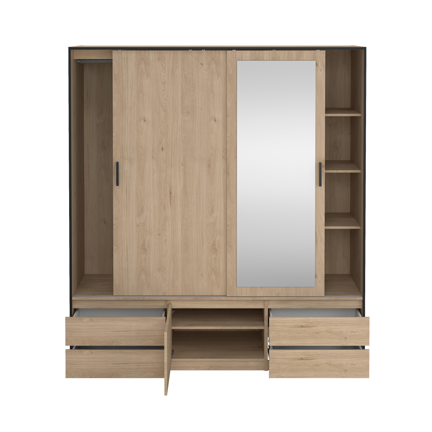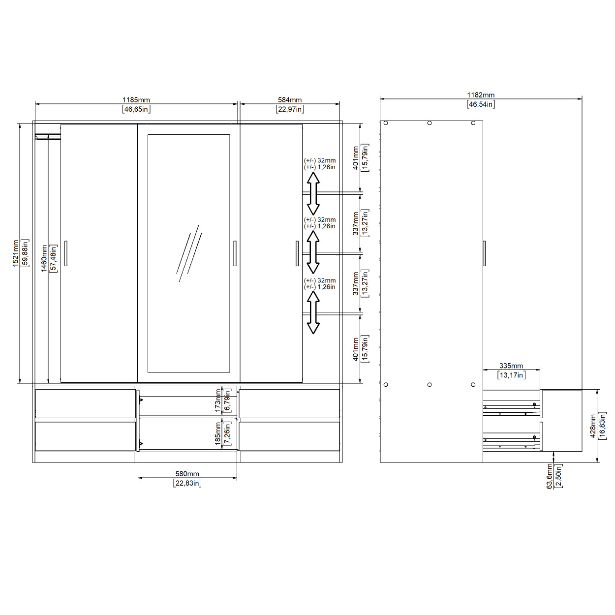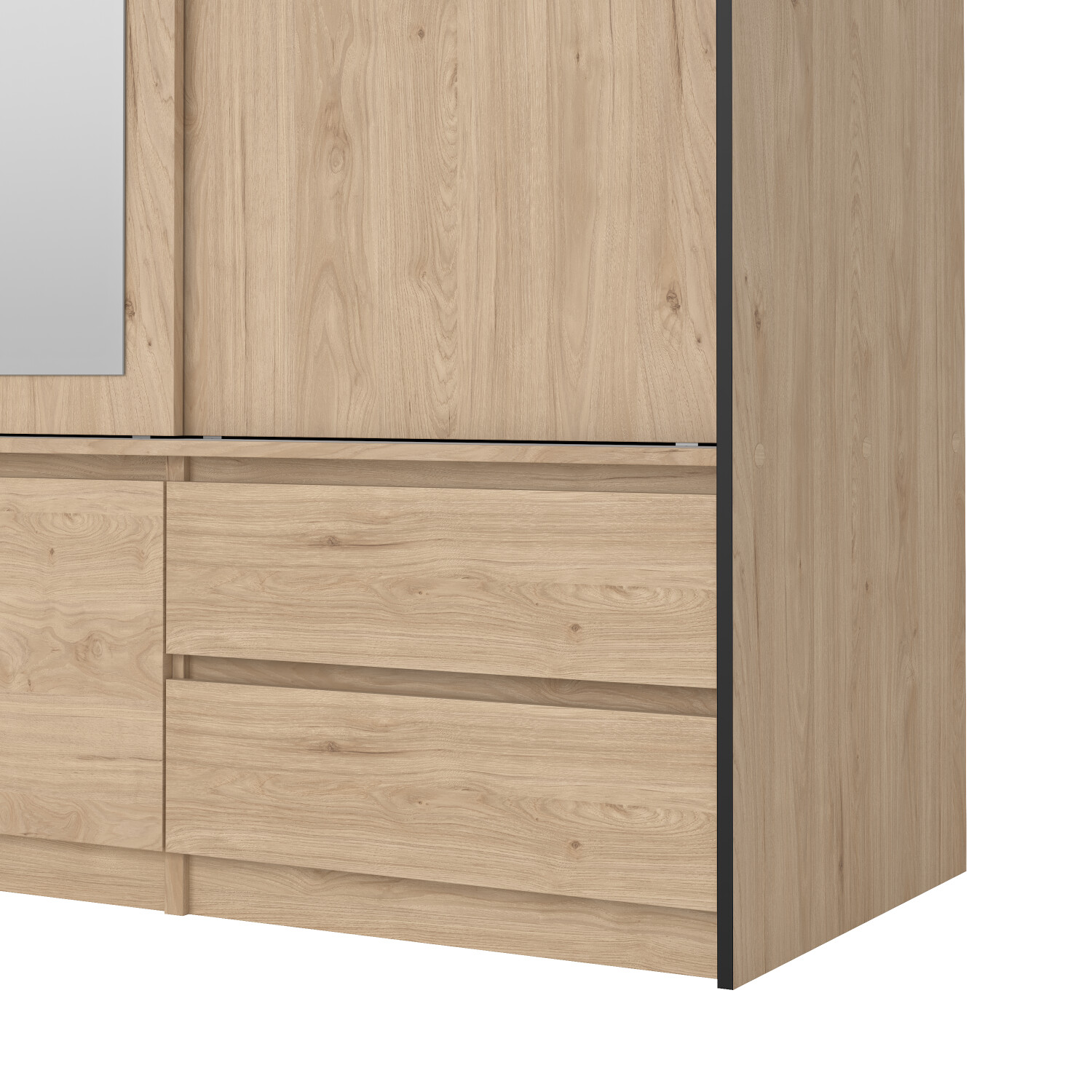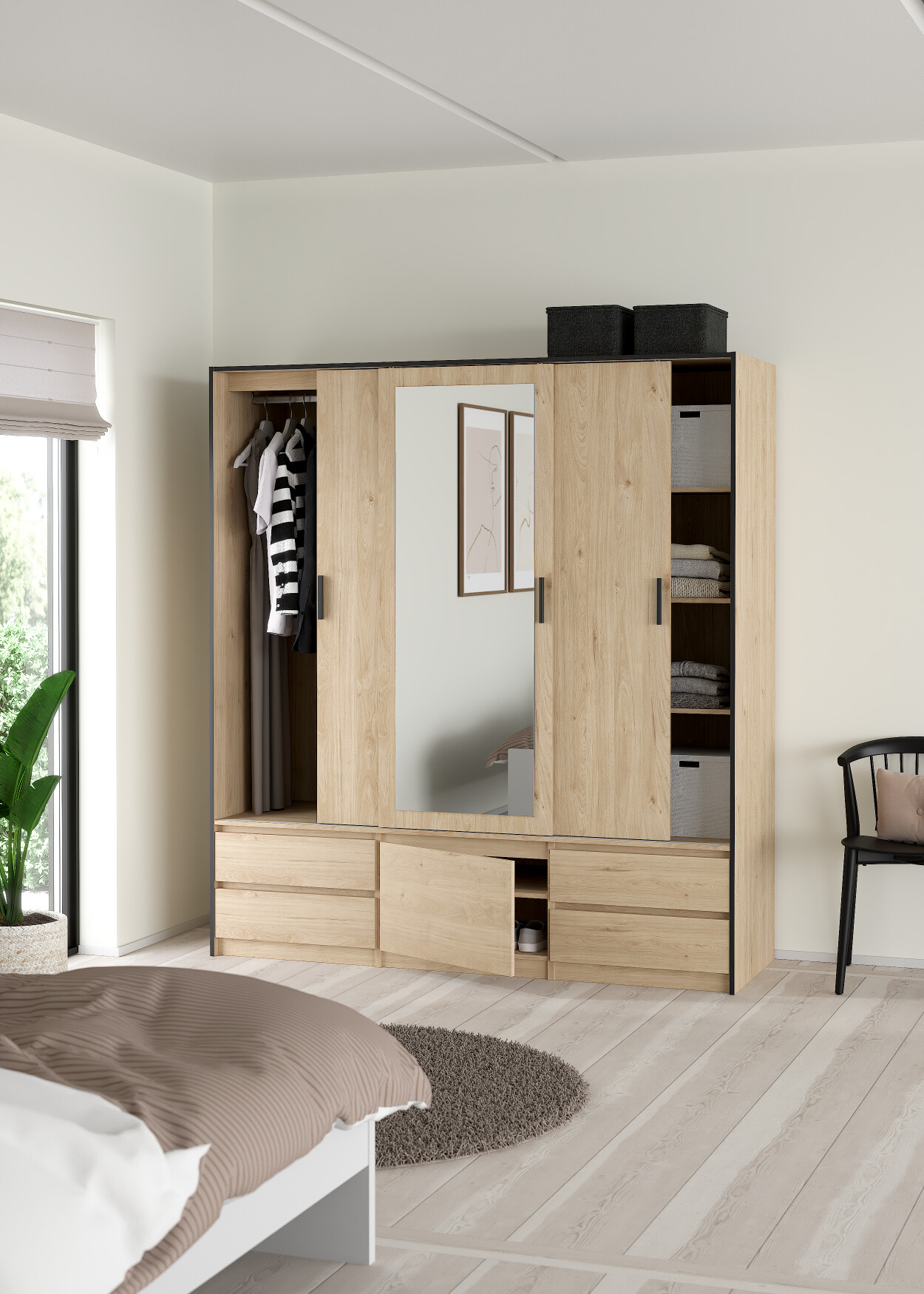 Inline garderobeskab 121 cm bredt, 2 skydedøre, 2 skuffer hvid og egelook.
