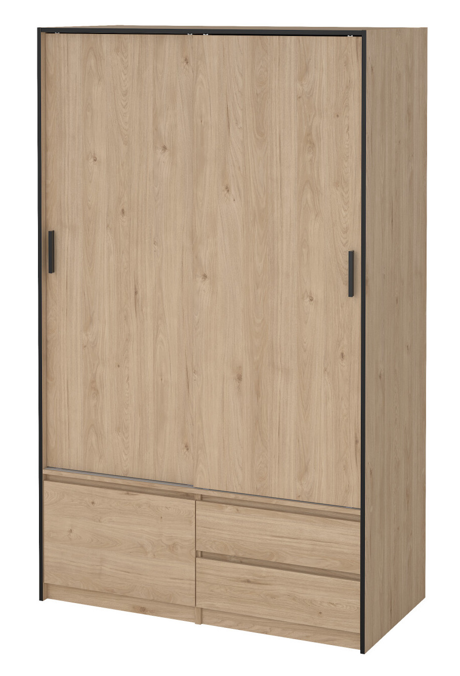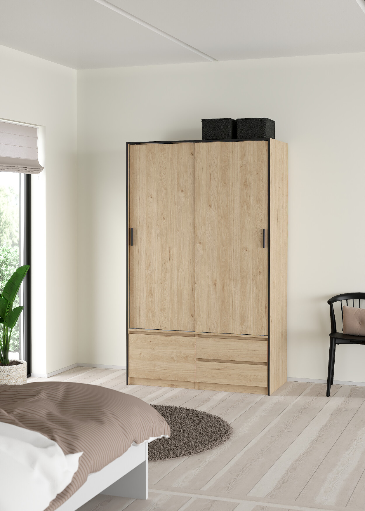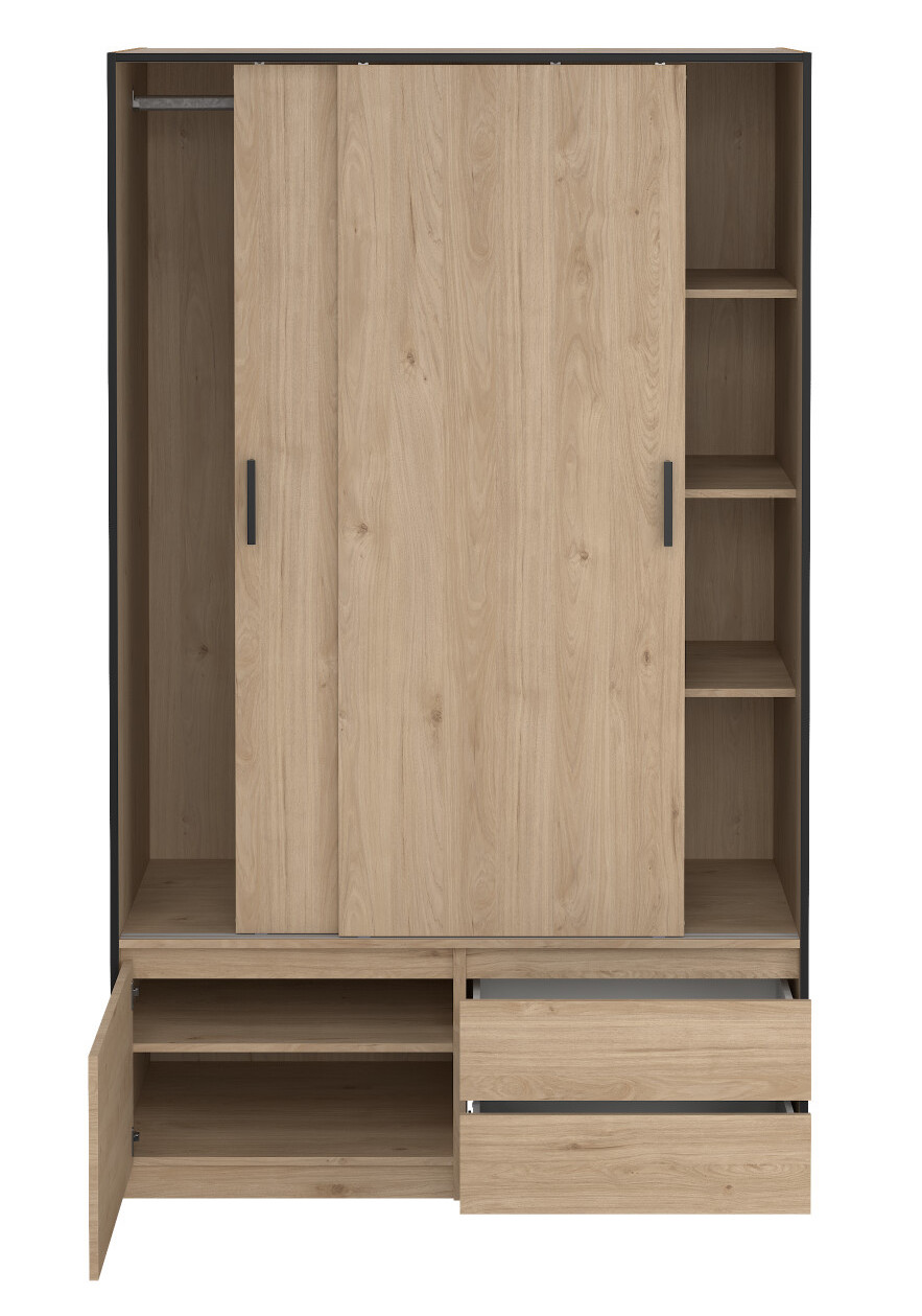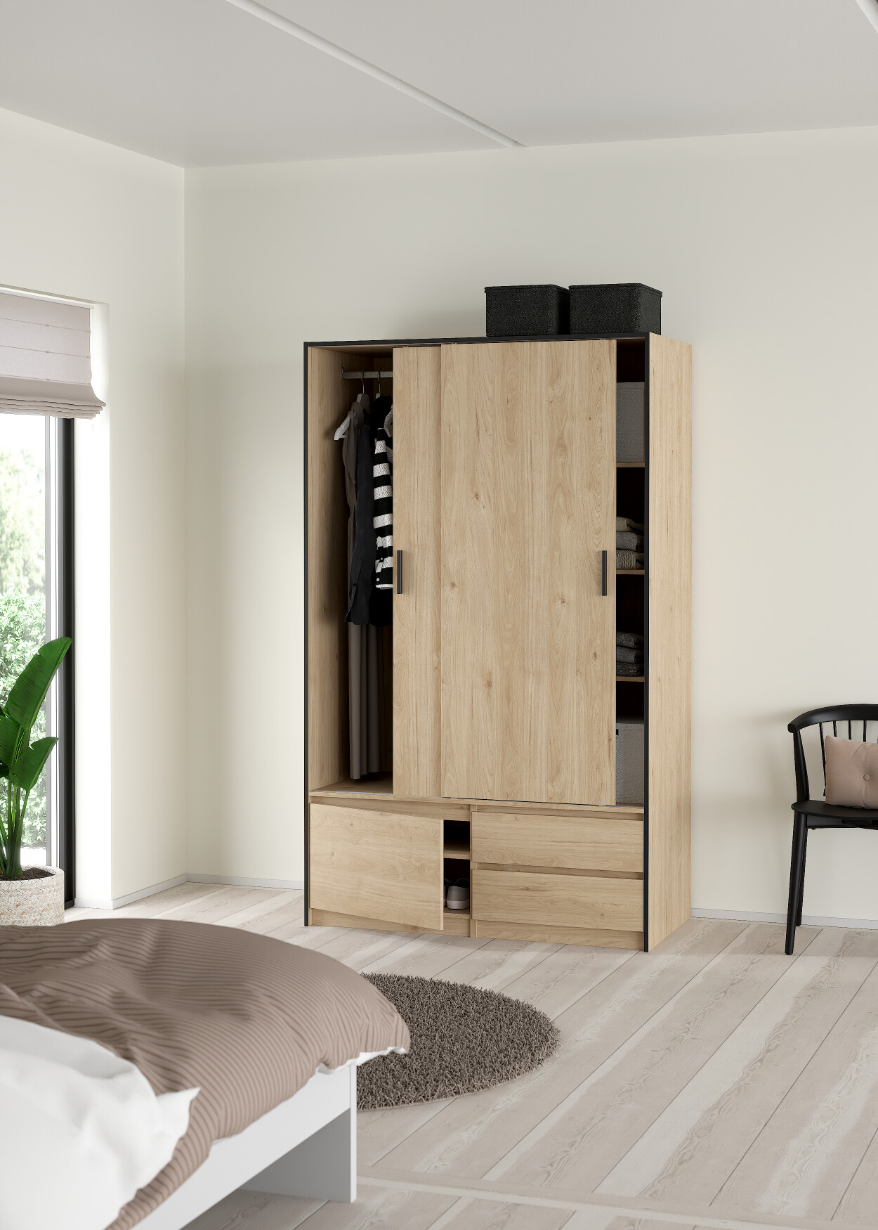 Inline garderobeskab 121 cm bredt, 2 skydedøre, 2 skuffer hvid og egelook.