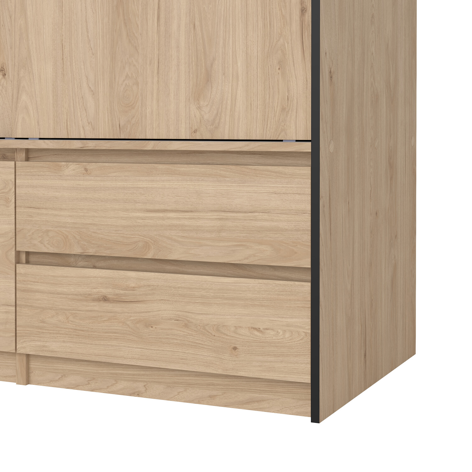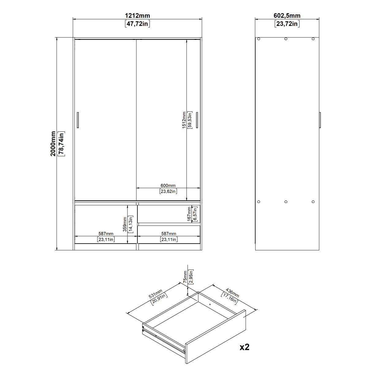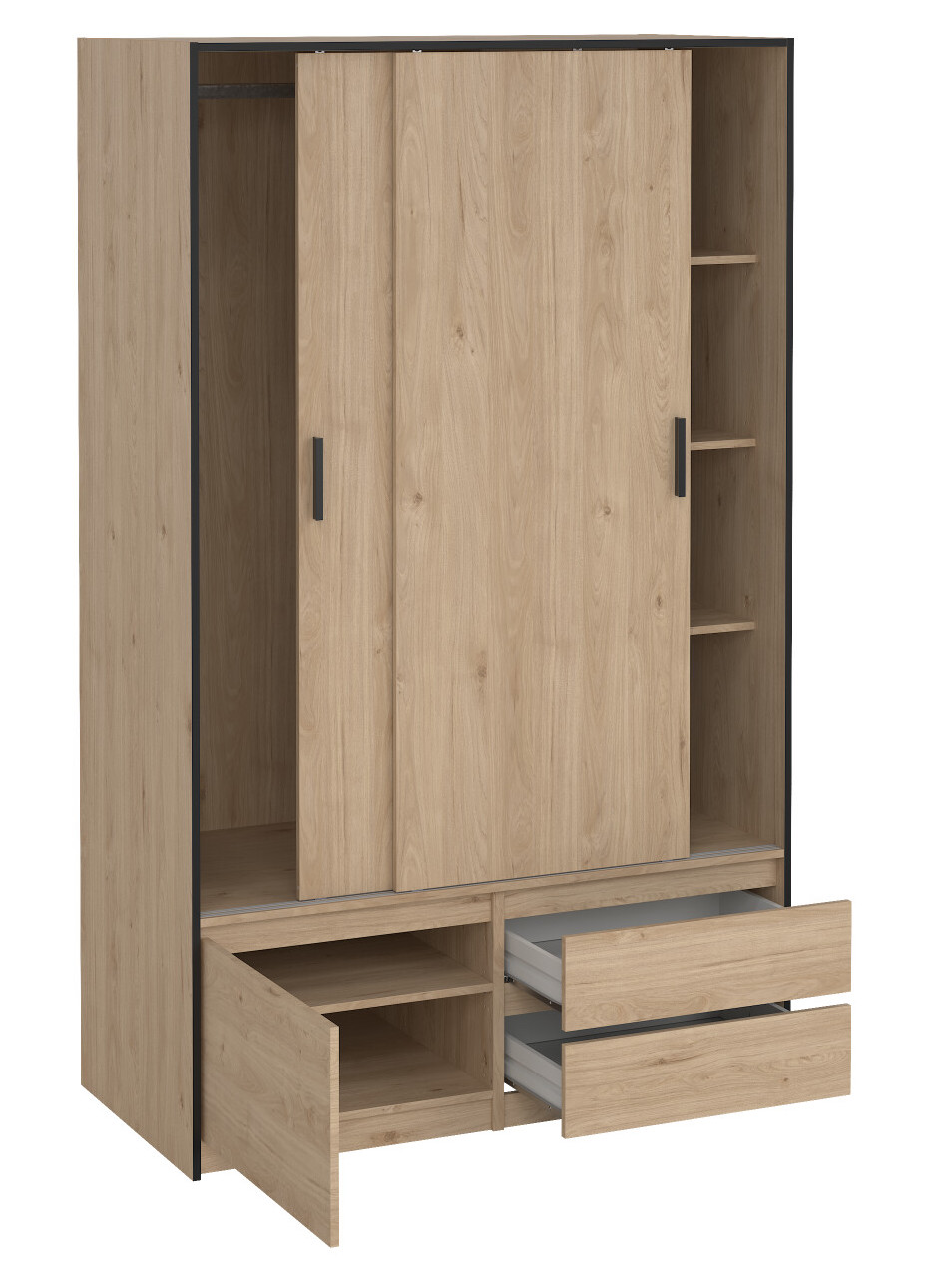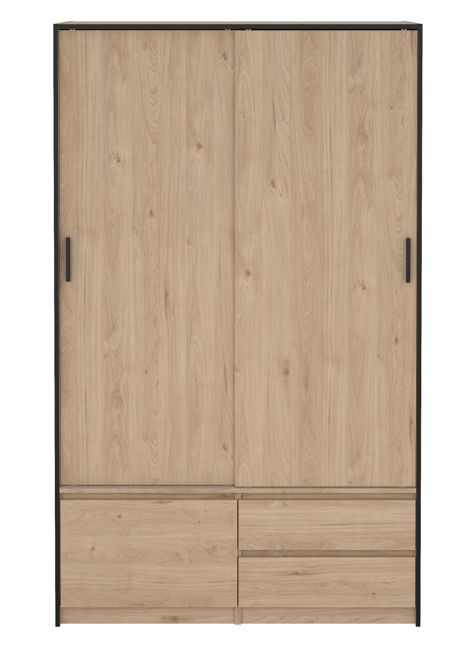 Inline garderobeskab 121 cm bredt, 2 skydedøre, 2 skuffer hvid og egelook.