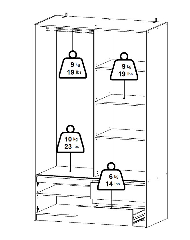 Garderobeskabet måler: H: 200,0 cm, B: 121,2 cm, D: 60,3 cm.
