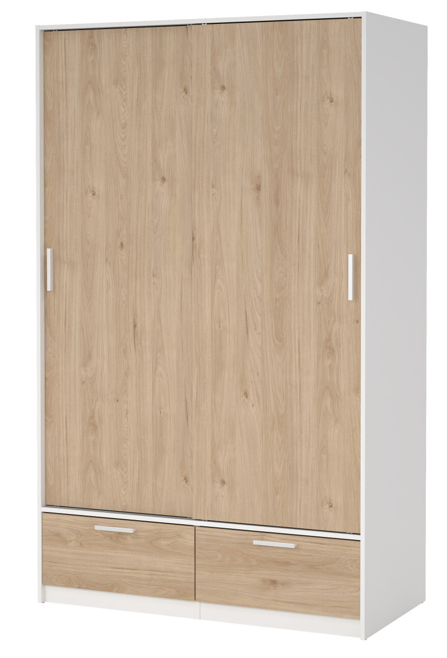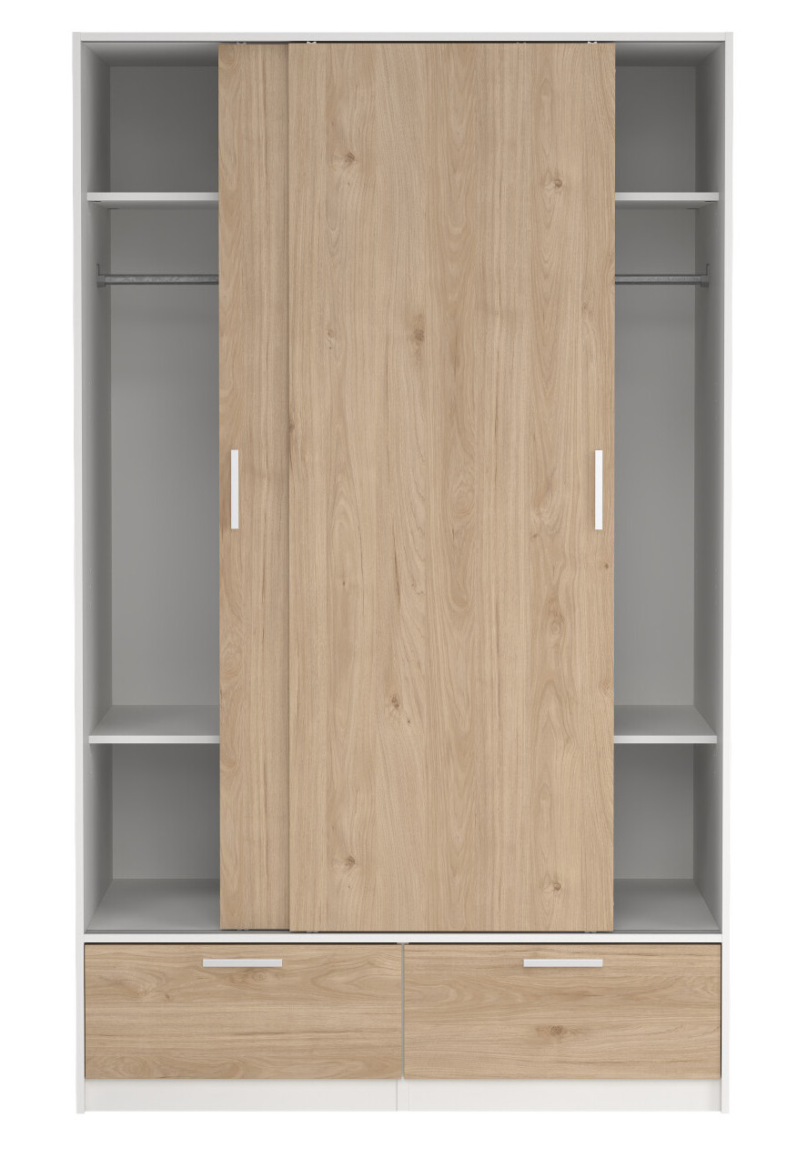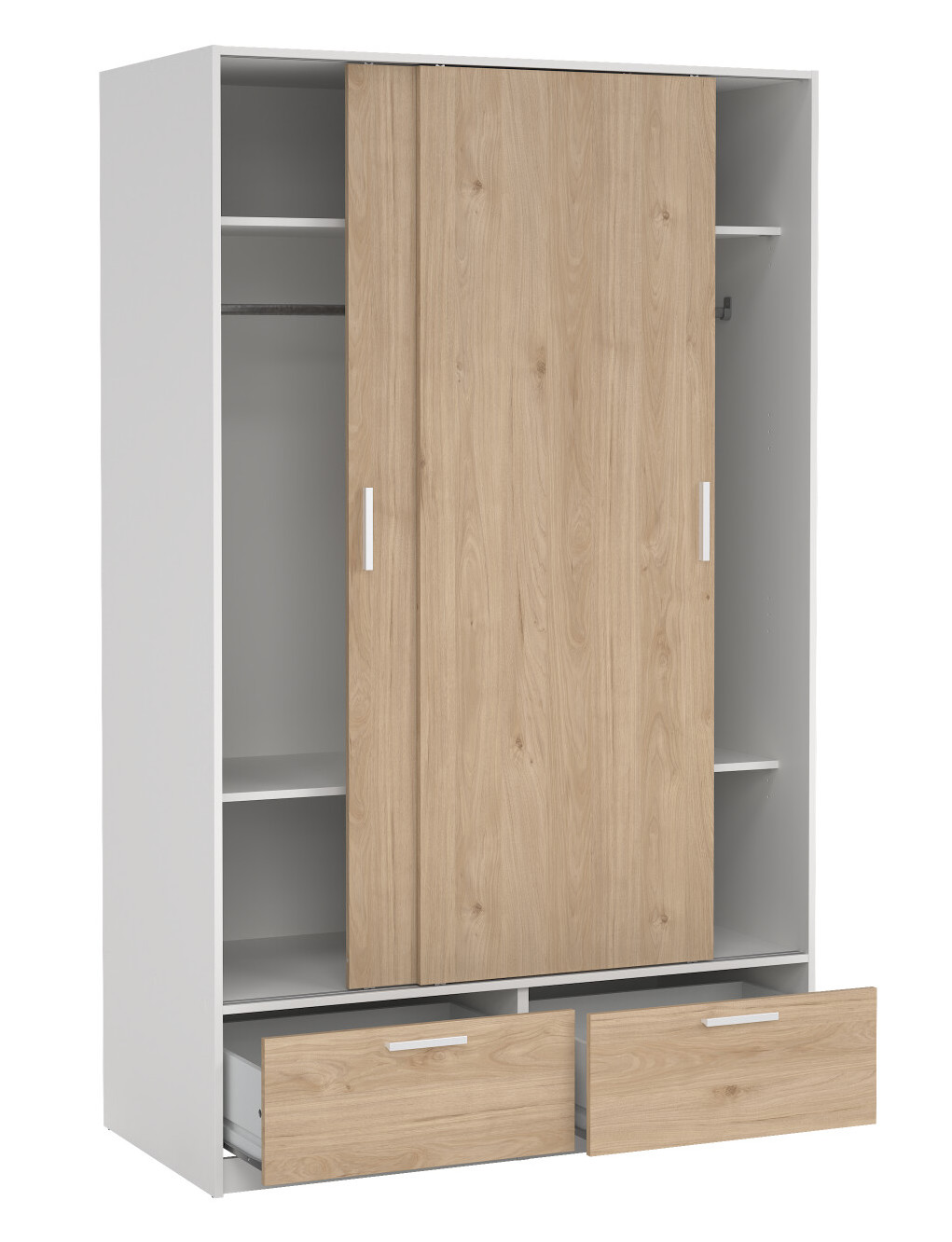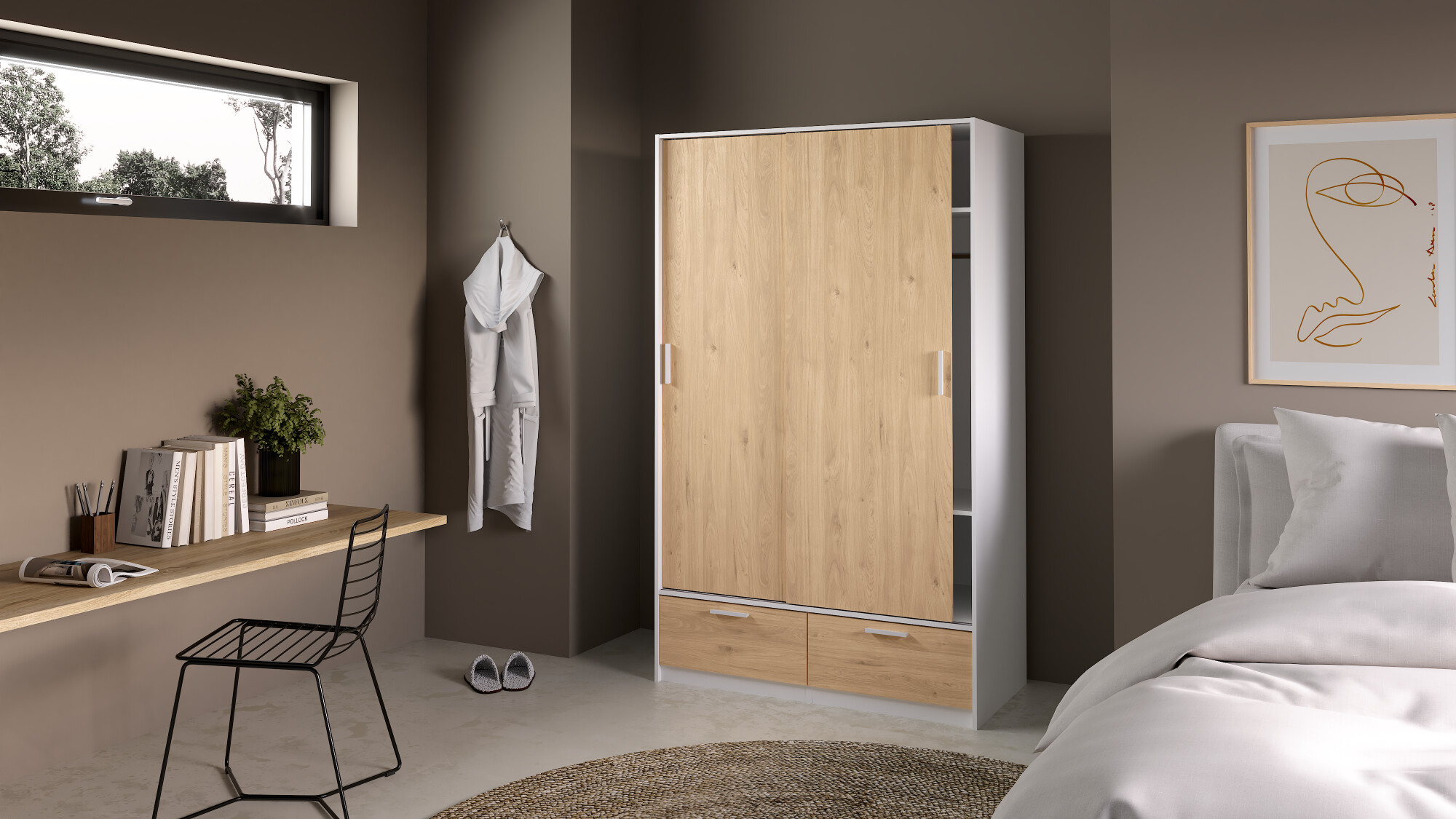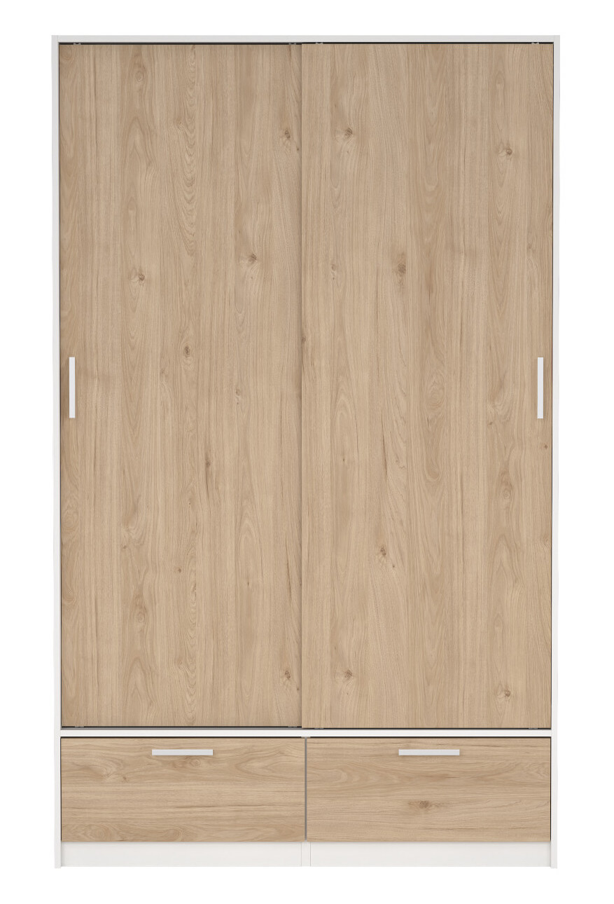 Inline garderobeskab 121 cm bredt, 2 skydedøre, 2 skuffer egelook og sort.