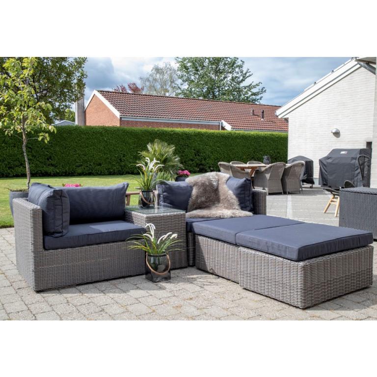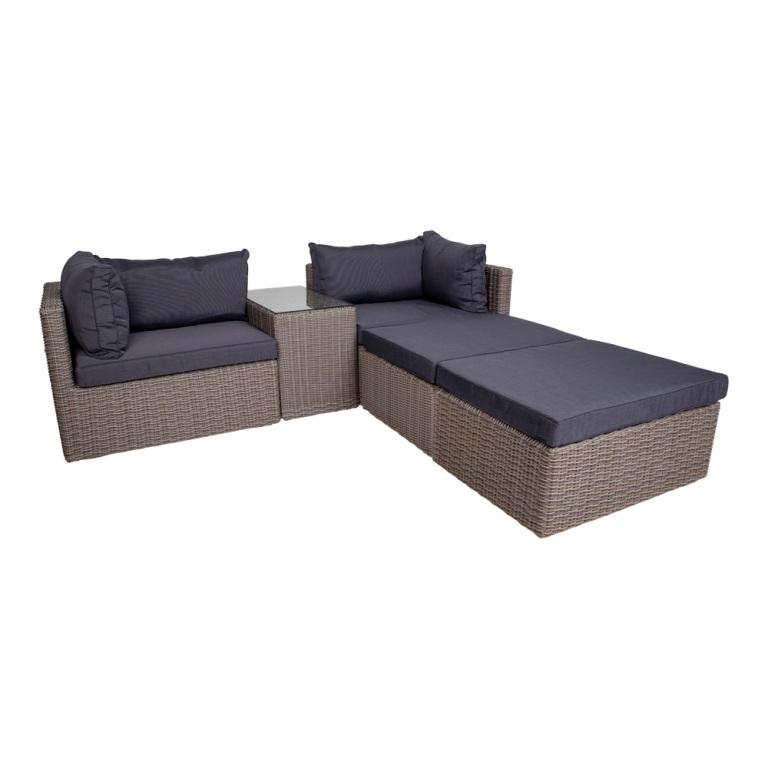 Bahama sofasæt i kubu grå PE rattan leveres med sorte slidstærke hynder i polyester. Sofasættet består af: