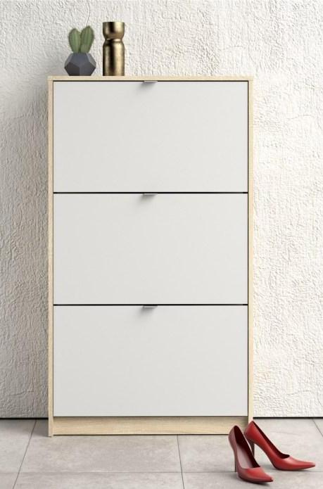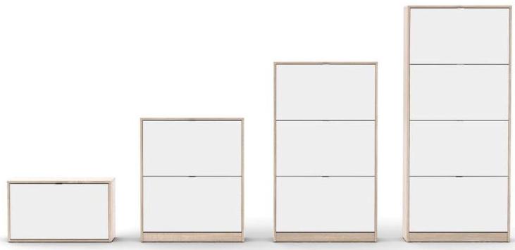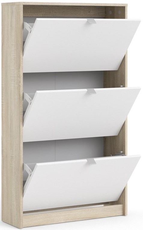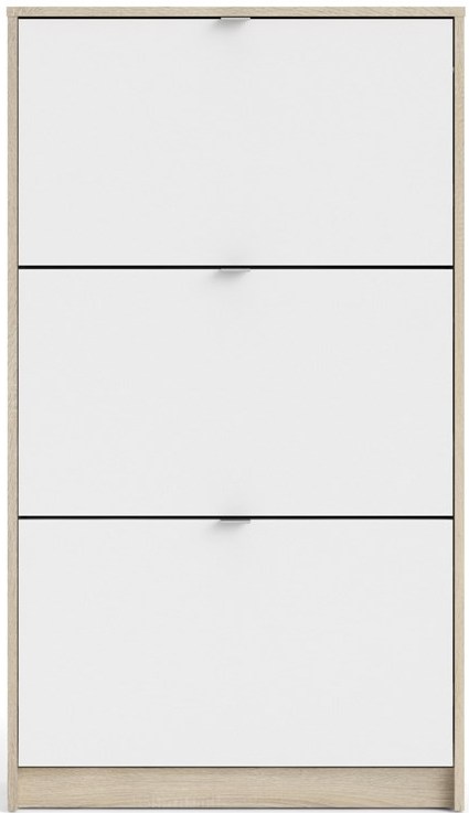 Askepot skoskab hvidt og ege look med 3 vippelåger og plads til 18 par sko.