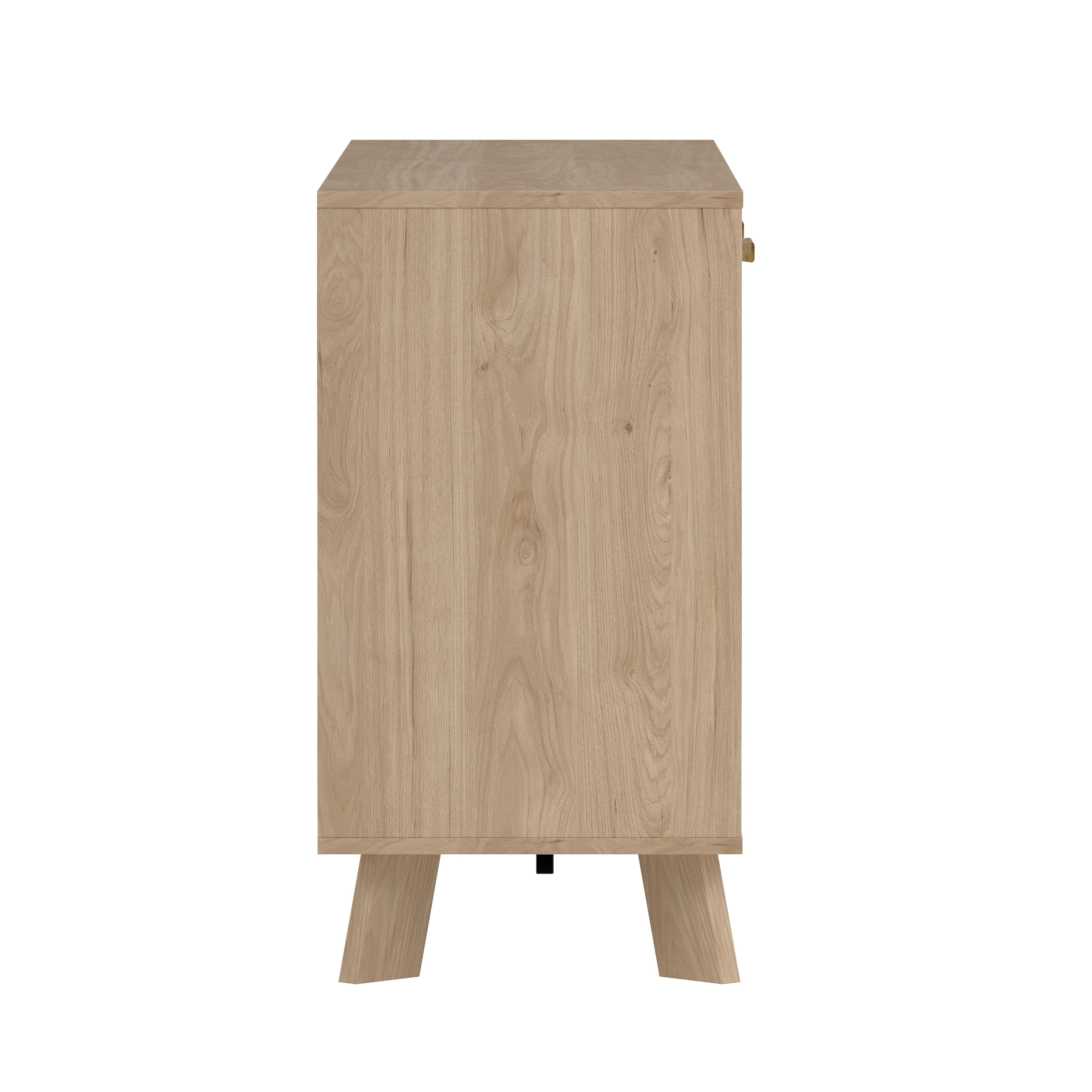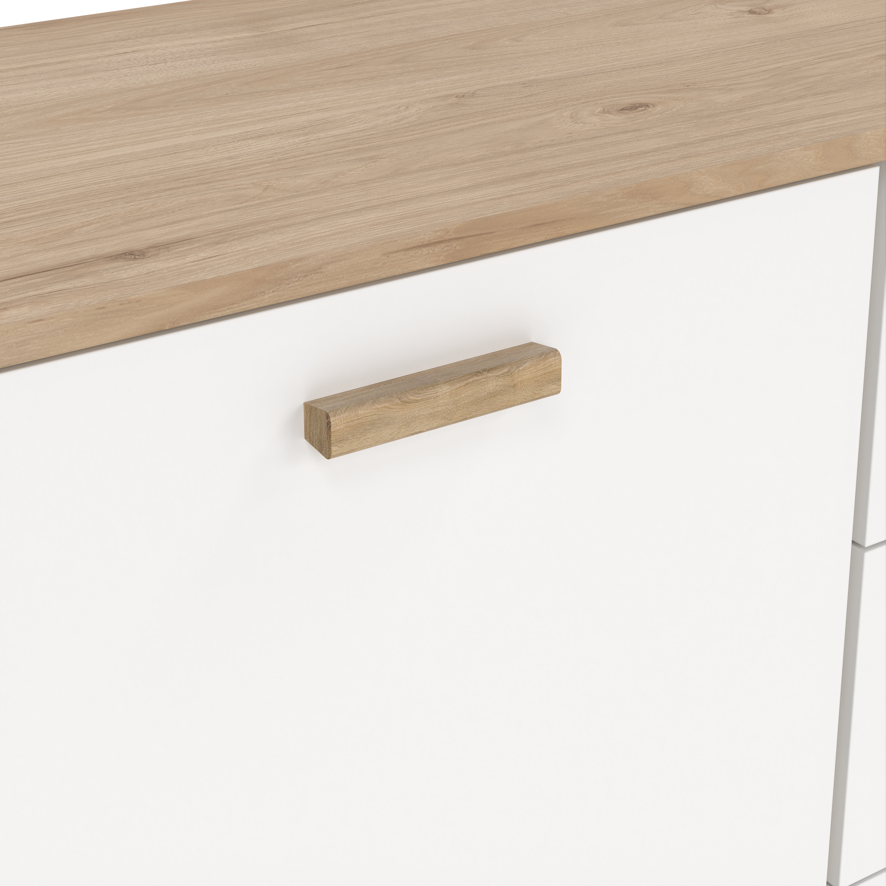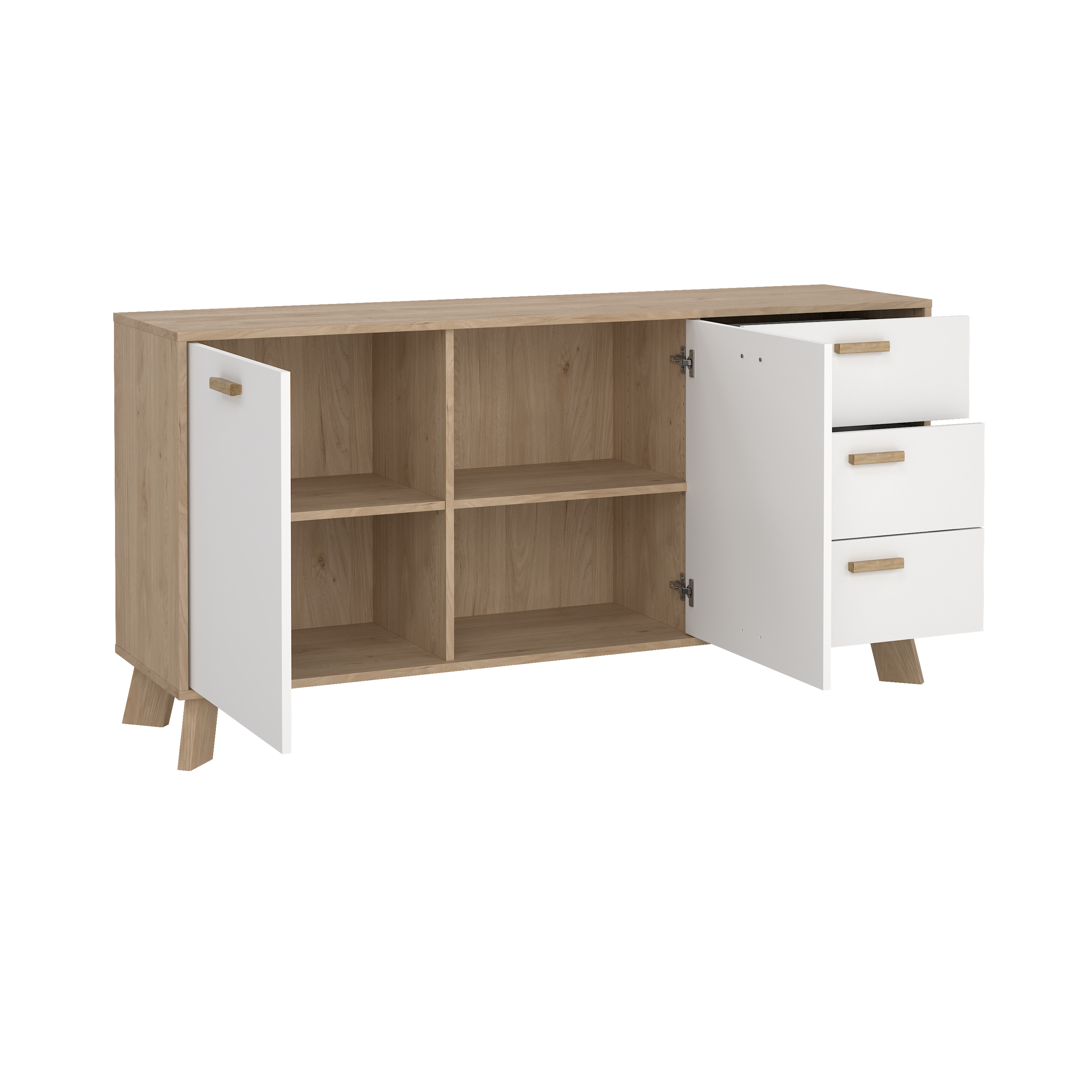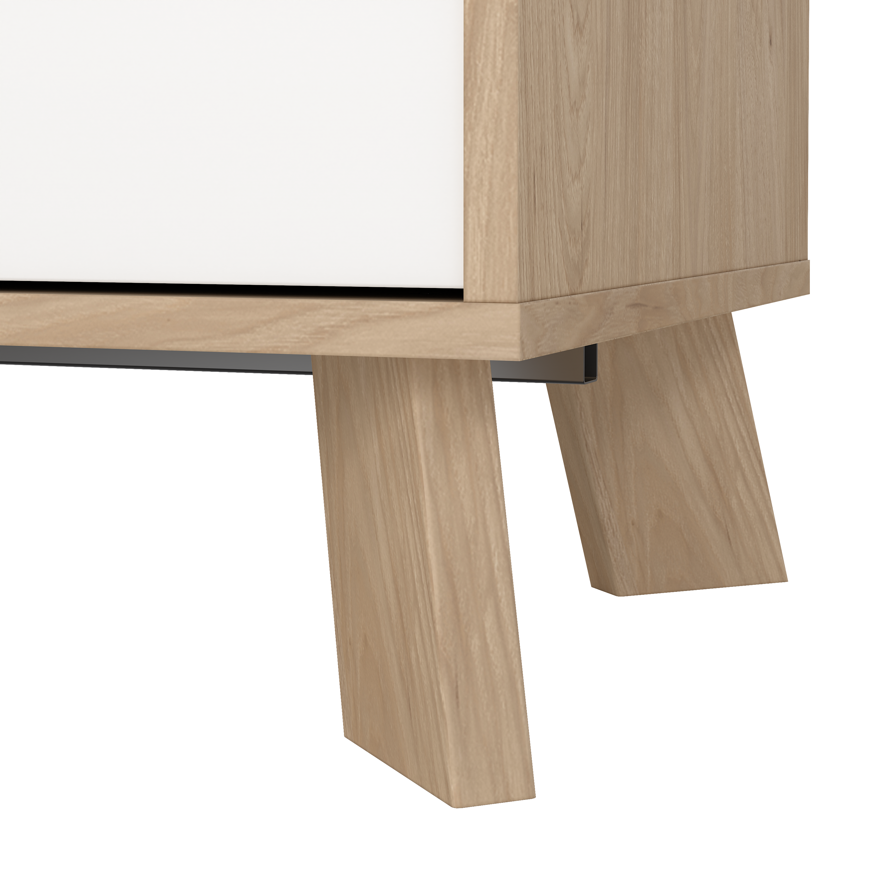 Skænken er fremstillet i egelook med hvide detaljer. Designet til at øge funktionalitet og opbevaringsplads samtidig med at møblet giver et frisk pust til rummet med dets unikke design.