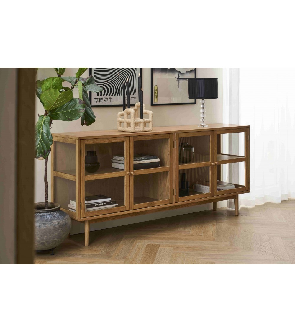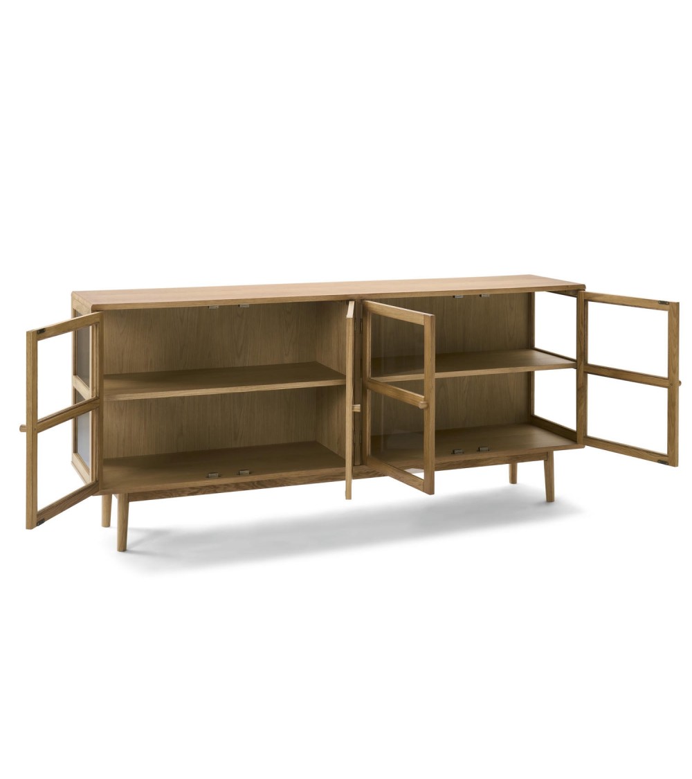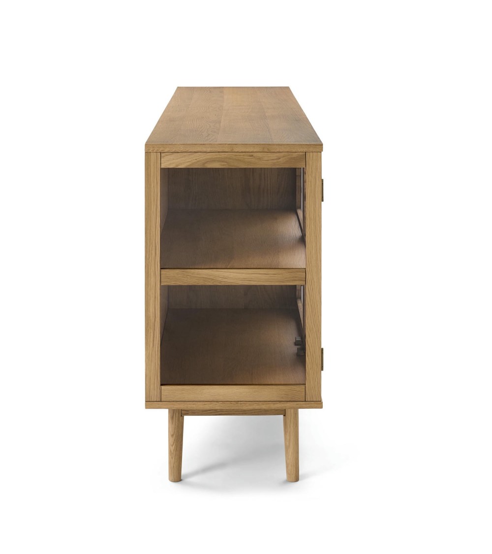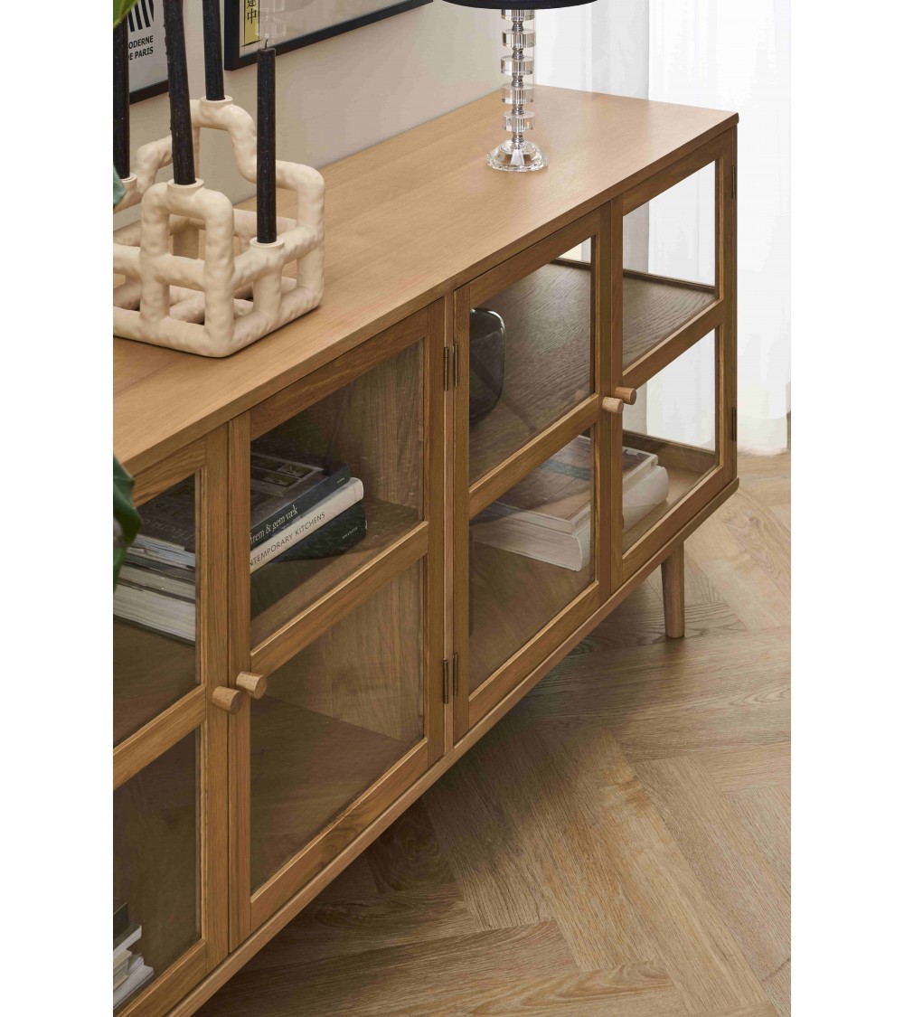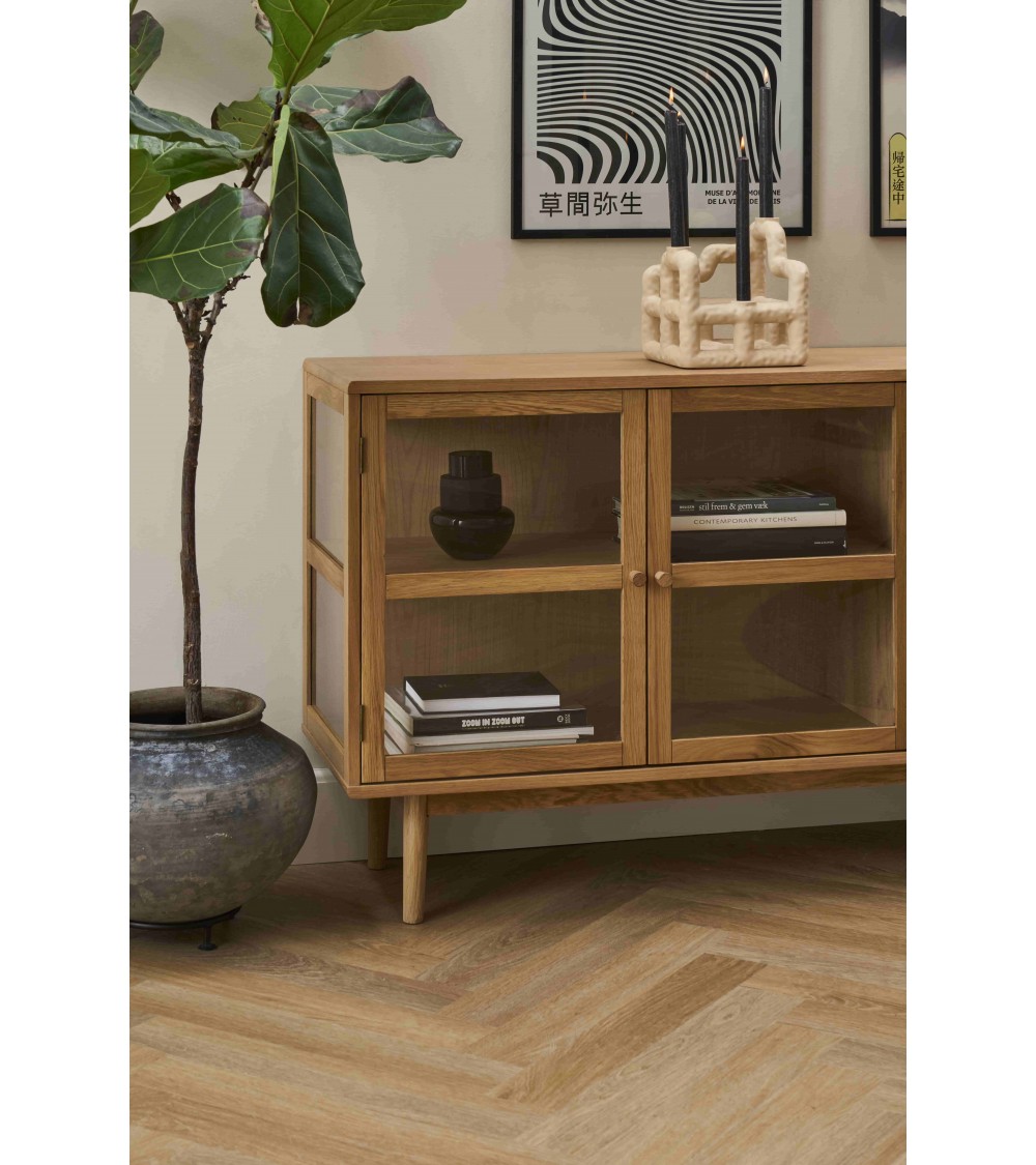 Med tre hærdede glaslåger i egetræsramme får du både beskyttelse og et elegant indkig til dine ting. Bag lågerne finder du tre faste hylder (18 mm tykke), som giver praktisk opbevaring til service, glas eller dekorative genstande. Den naturlige lak fremhæver træets åremønstre og understreger det nordiske udtryk.