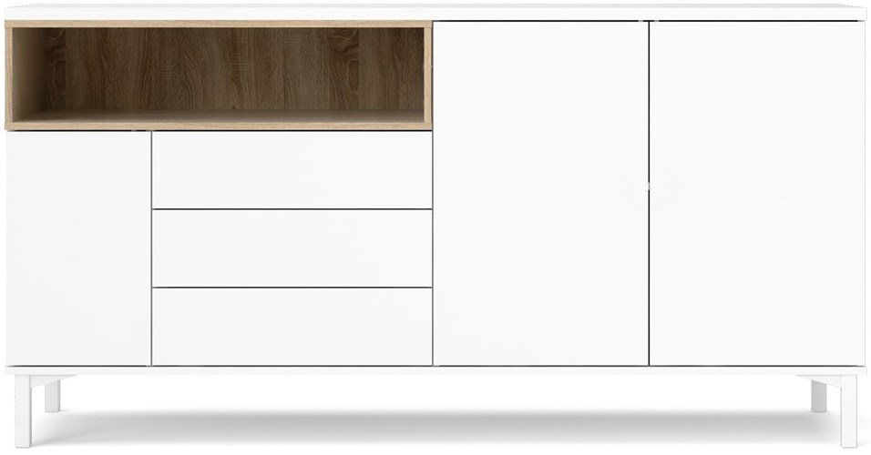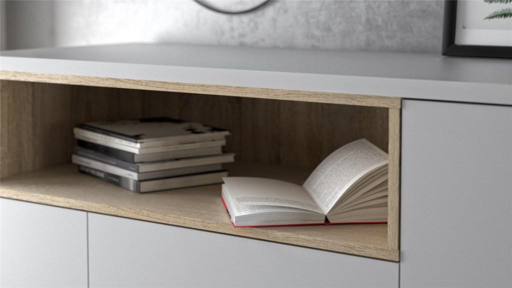 - Moderne bred skænk i hvid og med ege look ved hylde.