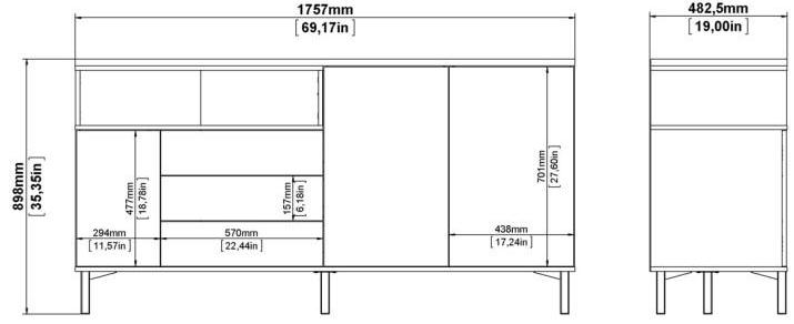 Skænken måler H: 89,8 cm, B: 175,7 cm, D: 48,3 cm.