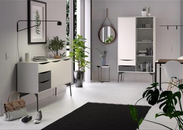 Vitrineskab med 2 skabe, glasdør, hylder og 2 skuffer, hvidt og produceret i Danmark.