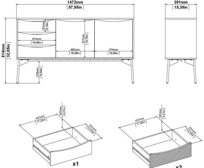 Vitrineskabet måler H: 81,4 cm, B: 147,2 cm, D: 39,1 cm.