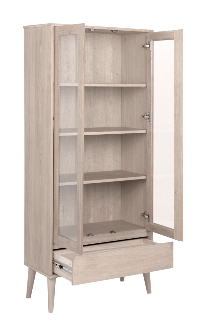 - Vitrineskabet er fremstillet i hvidpigmenteret egetræ finer, skabets ben er fremstillet i massiv egetræ.
