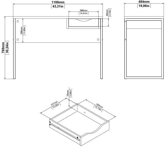 Skrivebordet måler B: 110 cm, D: 48,4 cm, H: 76,5 cm