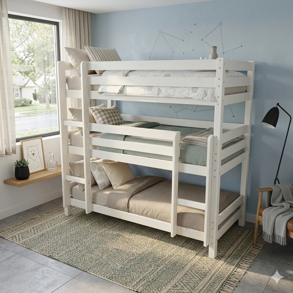 3 etage køjeseng i hvid pigmenteret massivt fyrretræ, hvor stolpernes tykkelse er 66 x 66 mm.