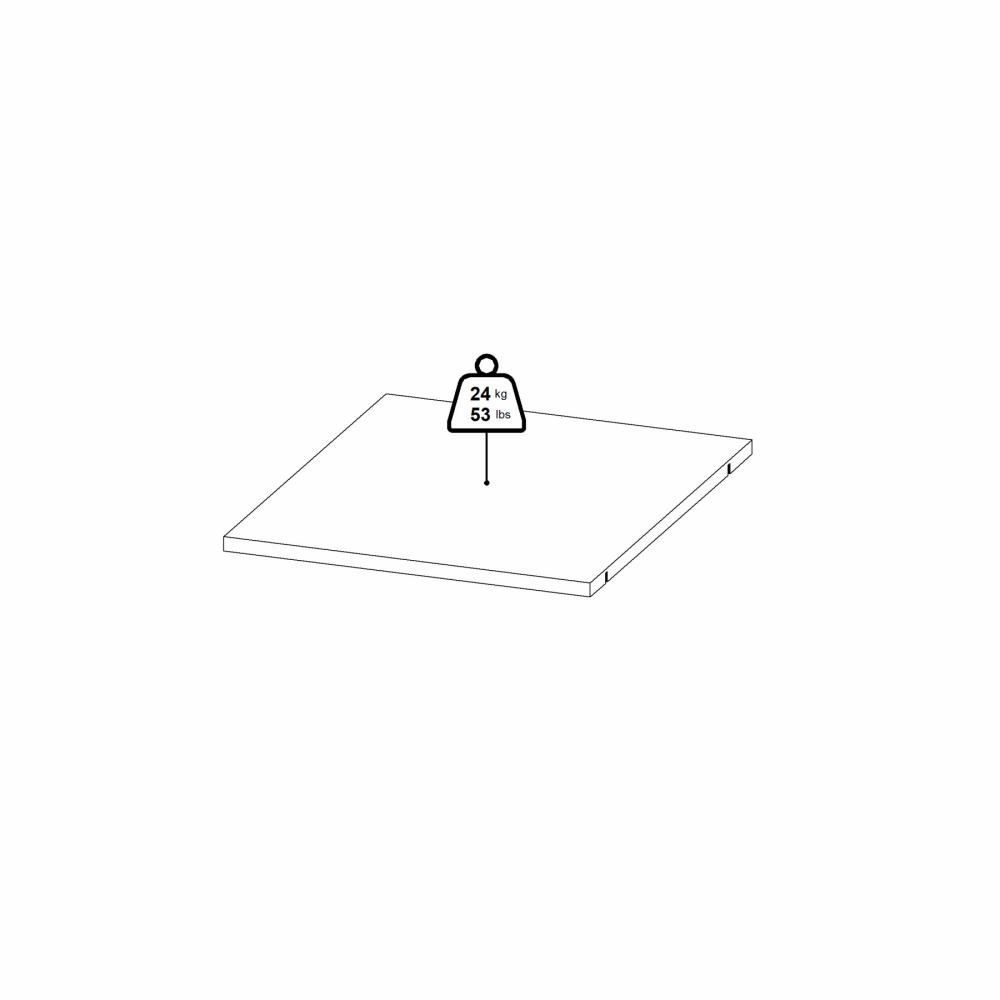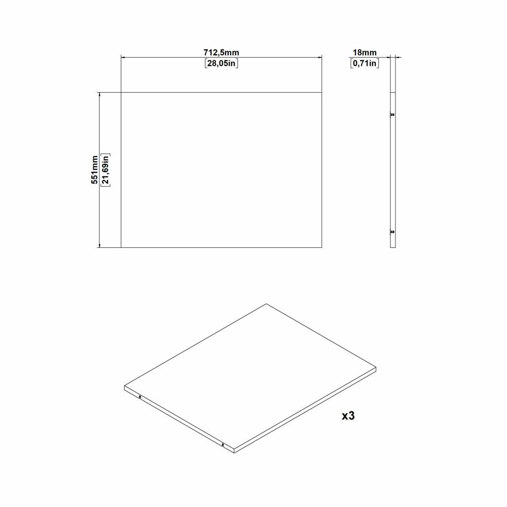Hver hylde måler 71,25 cm i bredden, 55,1 cm dybden og 1,8 cm i tykkelse, og hylderne er justerbare i højden ved montage i garderobeskabet.