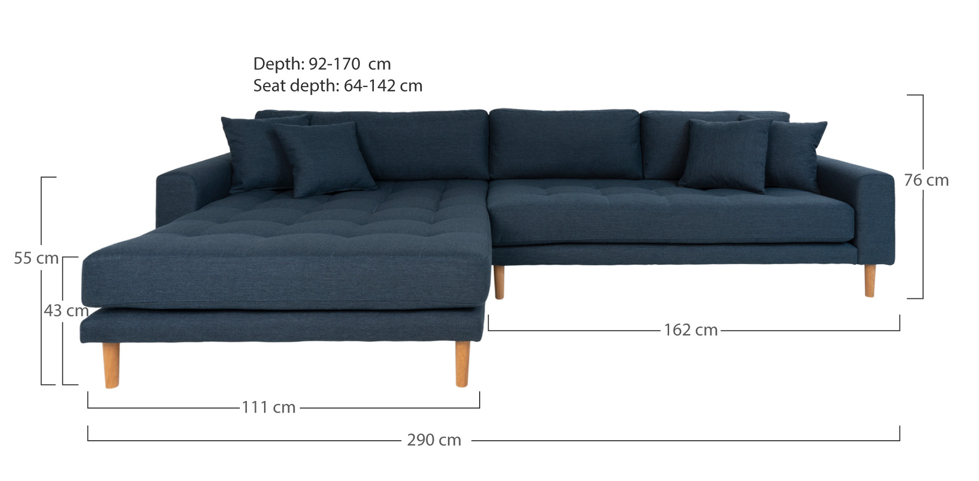 Sofaen måler L: 290 cm, D: 92-170 cm, H: 76 cm