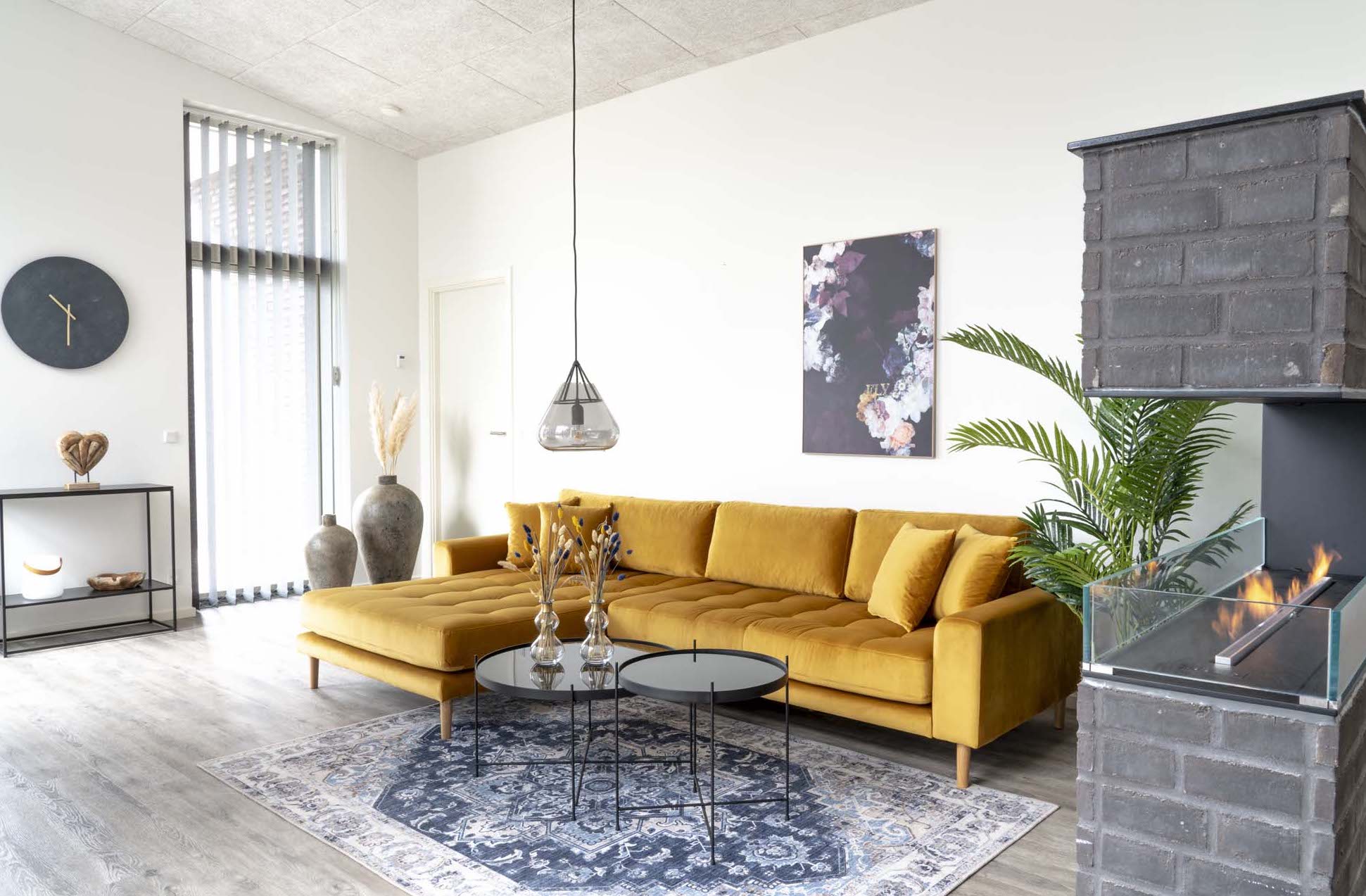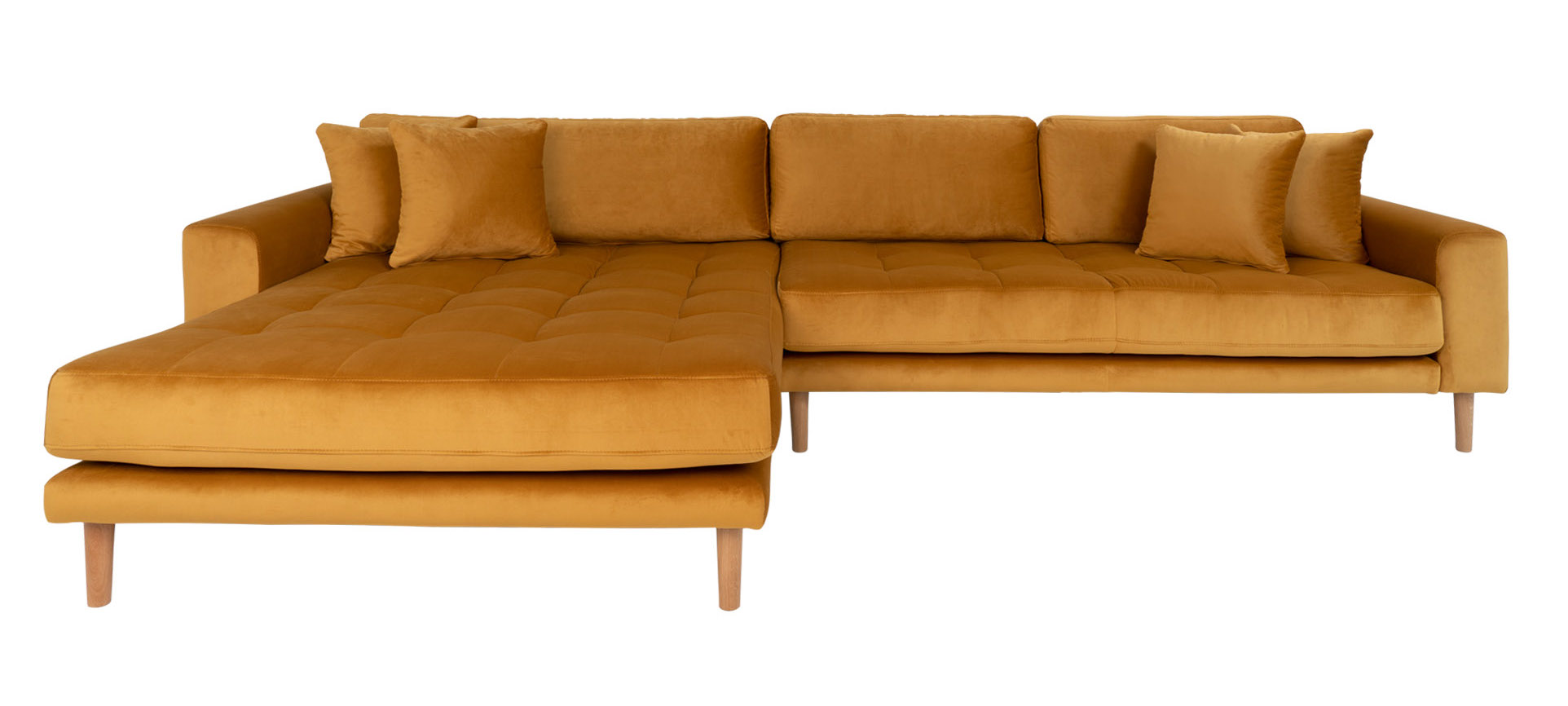 Riviera lounge sofa med chaiselong til venstre i sennepsgul velour, inklusiv 4 puder