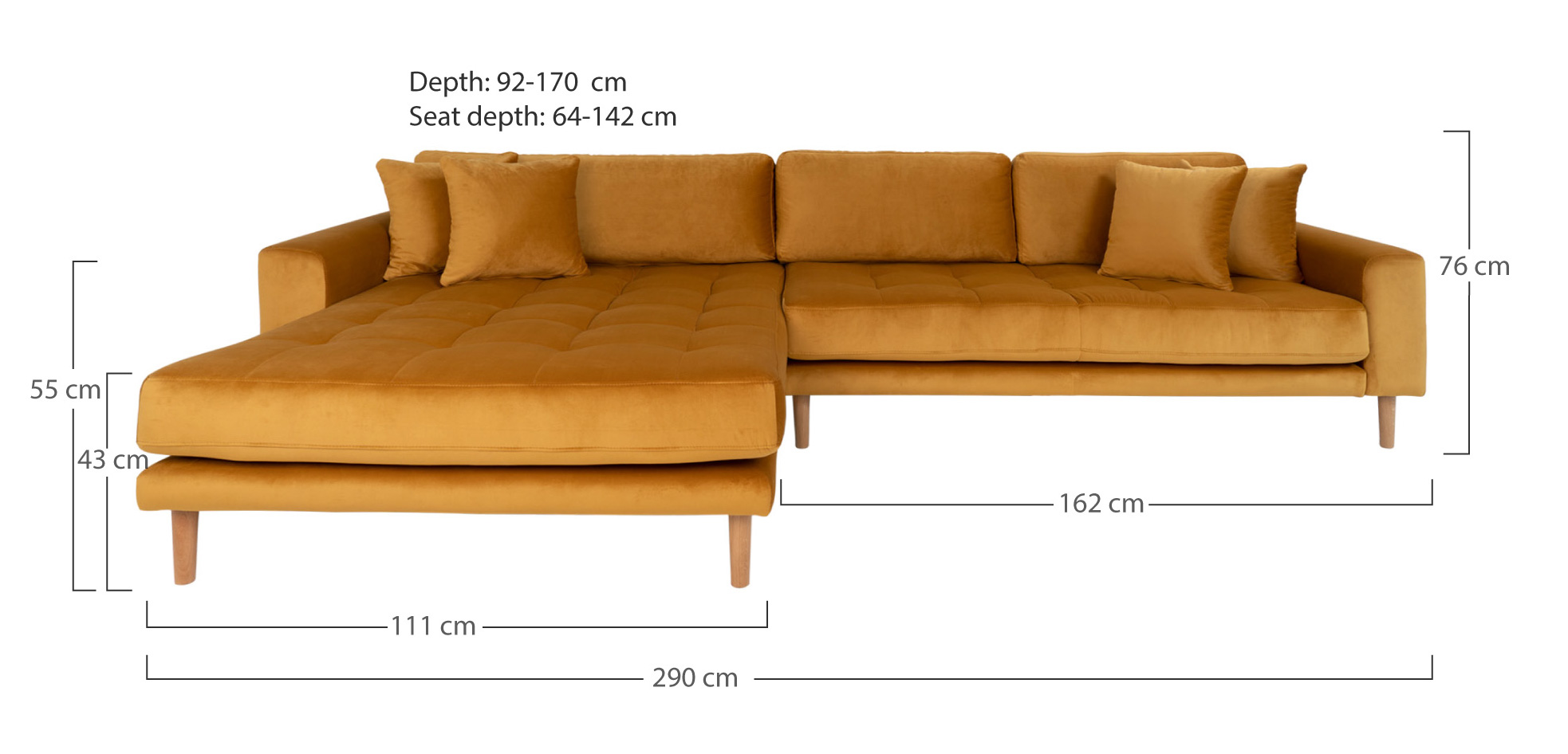 Sofaen måler L: 290 cm, D: 92-170 cm, H: 76 cm
